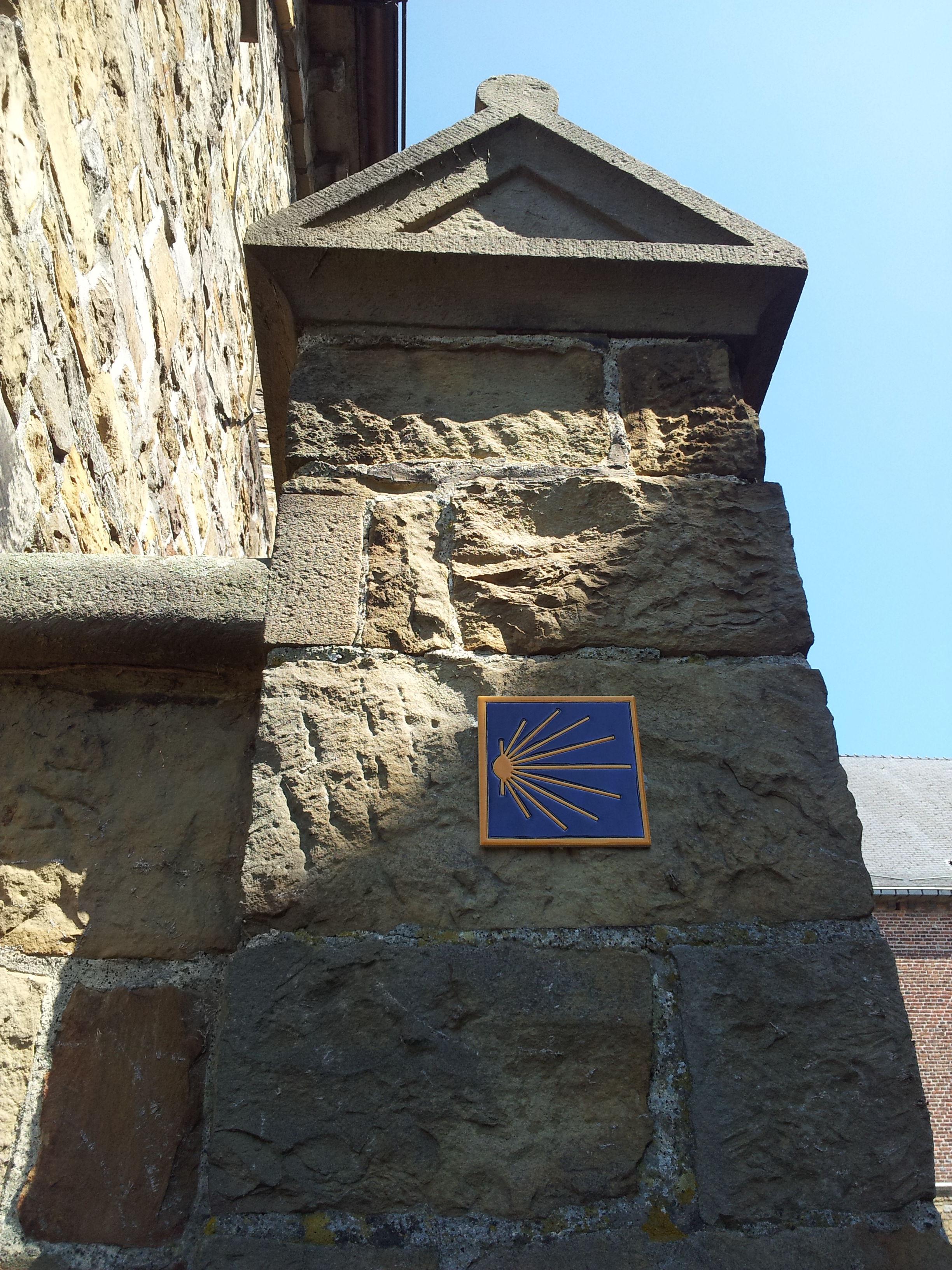Perdido: A falta de GPS y mapas decentes me perdí entre Esnaux y Huy. Paraojas de la vida moderna hiperconectada, una vez llegado al pequeño pueblo de Saint Severin un símbolo jacobeo fue el que me produjo la sensación de que iba por buen camino.